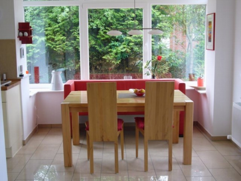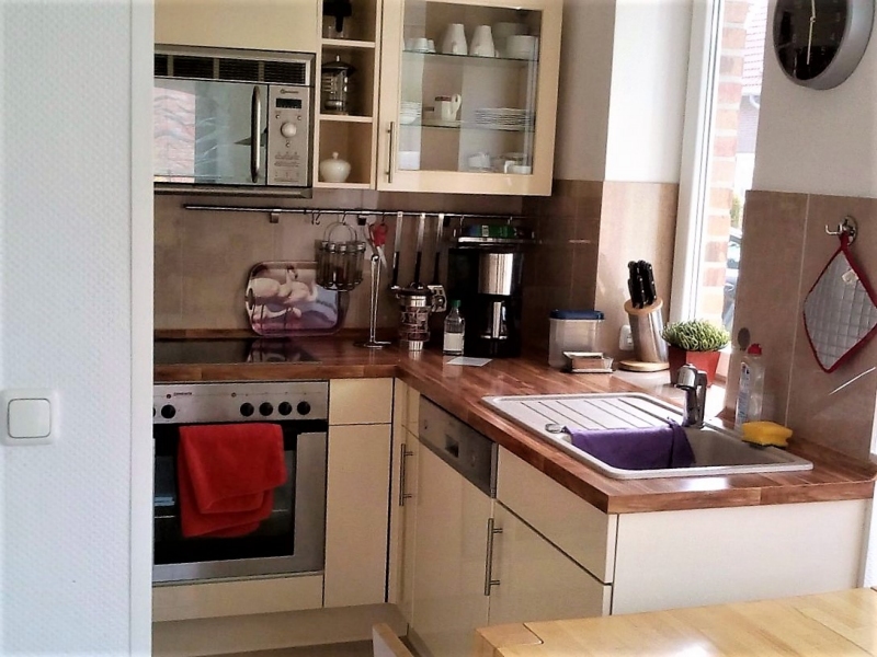 Die Küche ist mit Spülmaschine, Kaffeemaschine, Ceranfeld und reichlich Zubehör komfortabel ausgestattet. Der Essbereich ist großzügig und hell gestaltet.